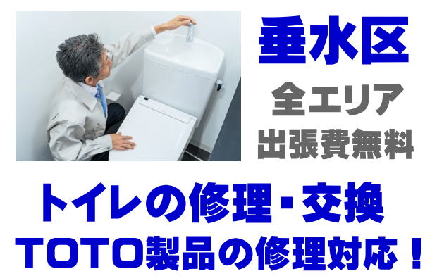 垂水区でTOTO製トイレの修理業者をお探しなら当社までお気軽にお問い合わせください。トイレ便器の水漏れ、タンクの故障、便座の修理などTOTO製トイレに関するトラブルなら何でもご相談ください。